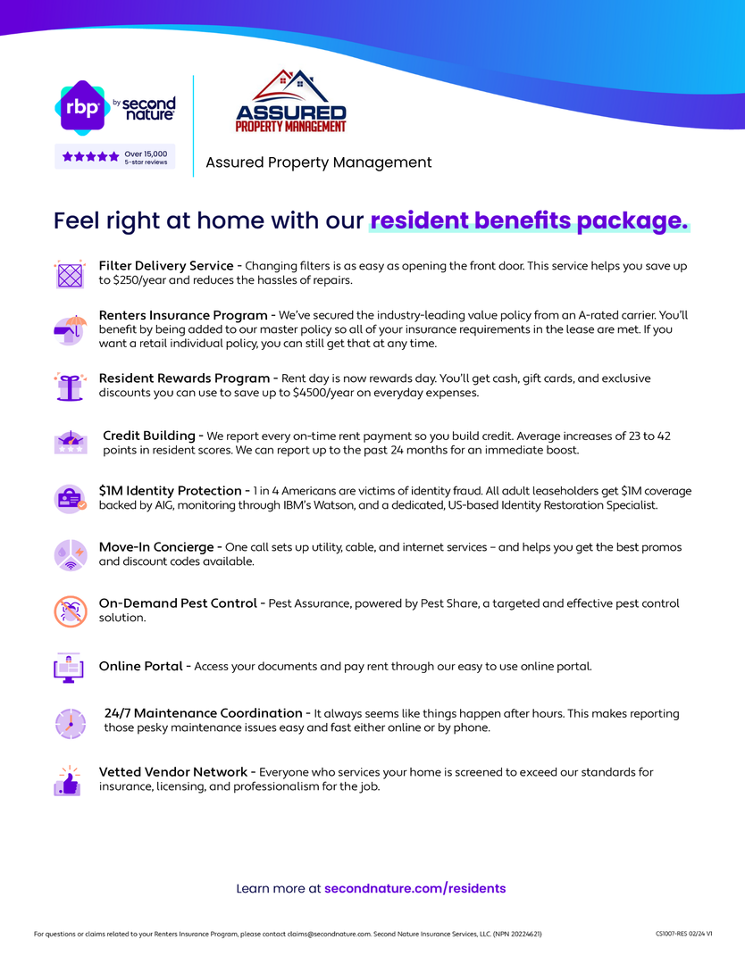 All residents are enrolled in the Resident Benefits Package (RBP) for $49/month which includes renters insurance, HVAC air filter delivery (for applicable properties), credit building to help boost your credit score with timely rent payments, $1M Identity Protection, move-in concierge service making utility connection and home service setup a breeze during your move-in, our best-in-class resident rewards program, and much more!